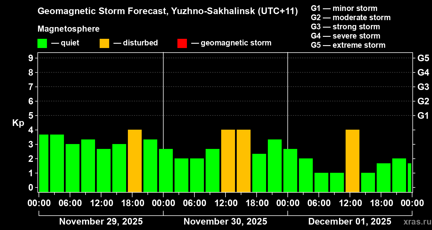 Geomagnetic storm forecast in Yuzhno-Sakhalinsk for Nov 29, 2025