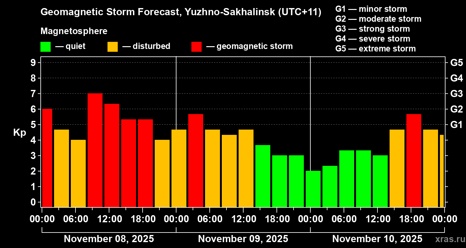 Geomagnetic storm forecast in Yuzhno-Sakhalinsk for Nov 08, 2025