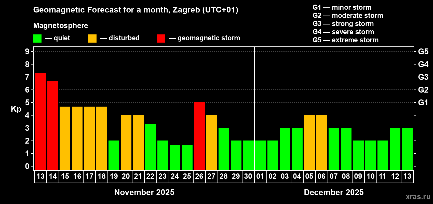 Geomagnetic storm forecast in Zagreb for Nov 13, 2025