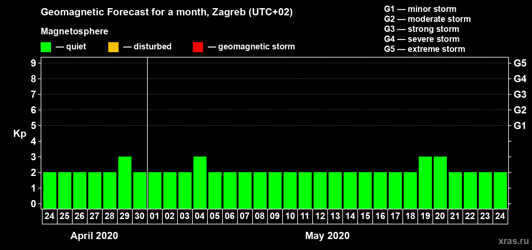 Geomagnetic storm forecast in Zagreb for Apr 24, 2020