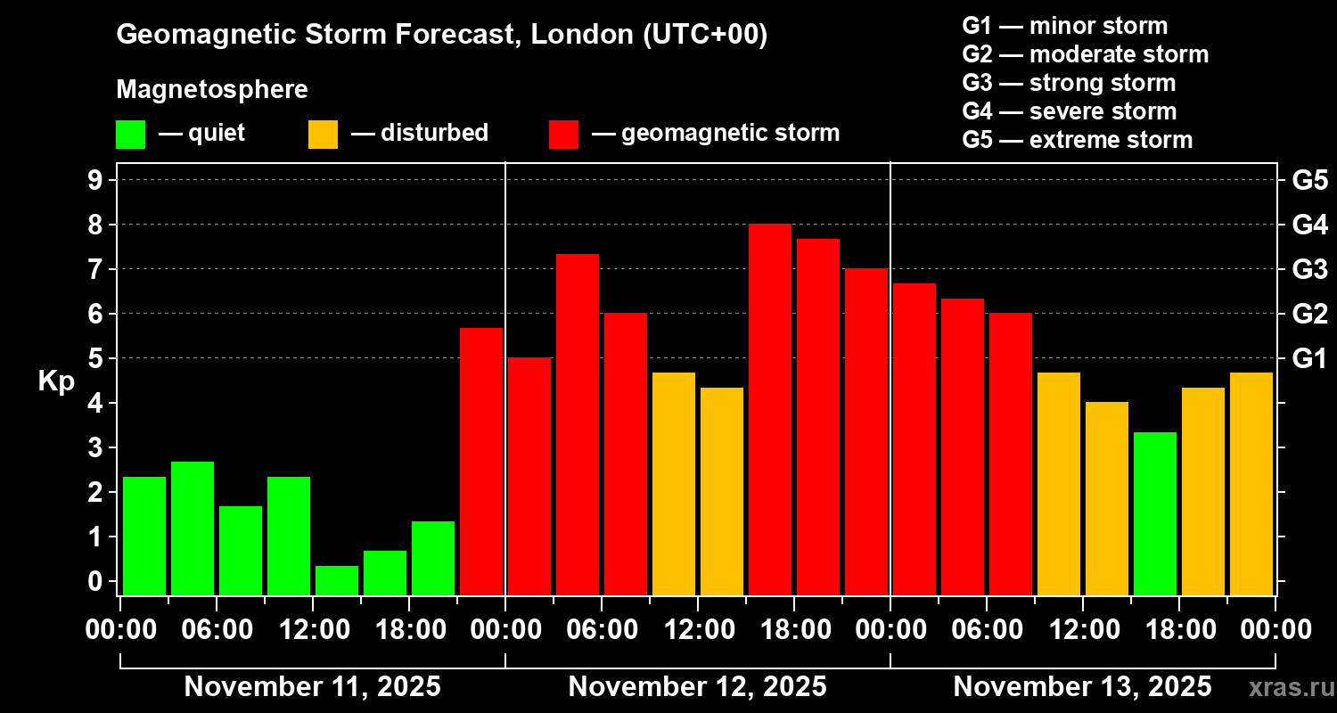 Geomagnetic storm forecast in London for Nov 11, 2025