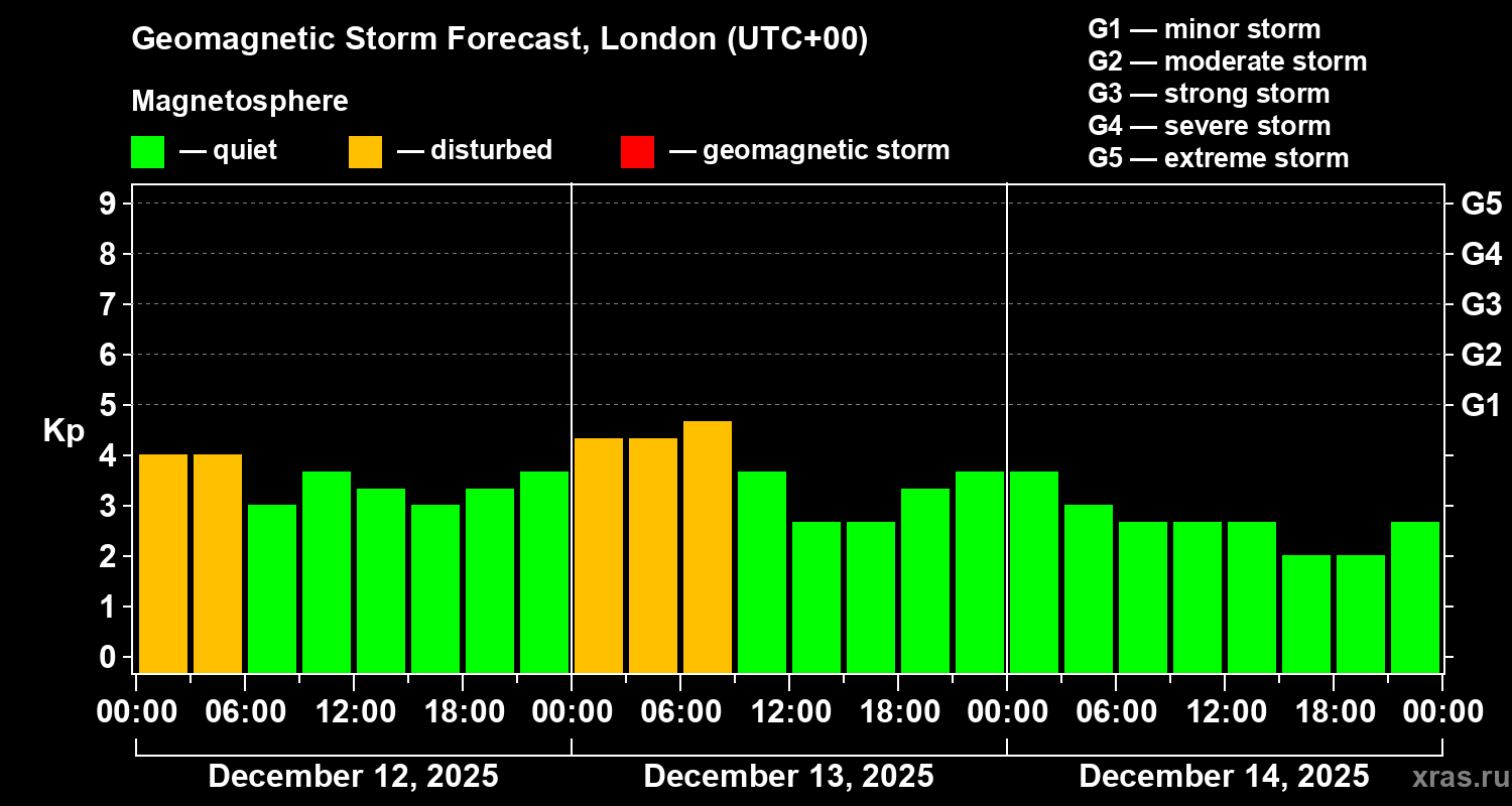 Geomagnetic storm forecast in London for Dec 12, 2025