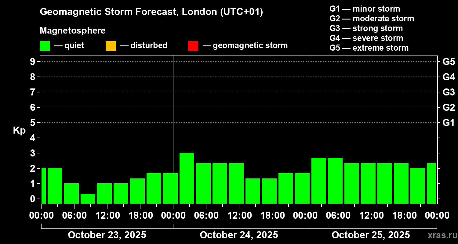 Geomagnetic storm forecast in London for Oct 23, 2025
