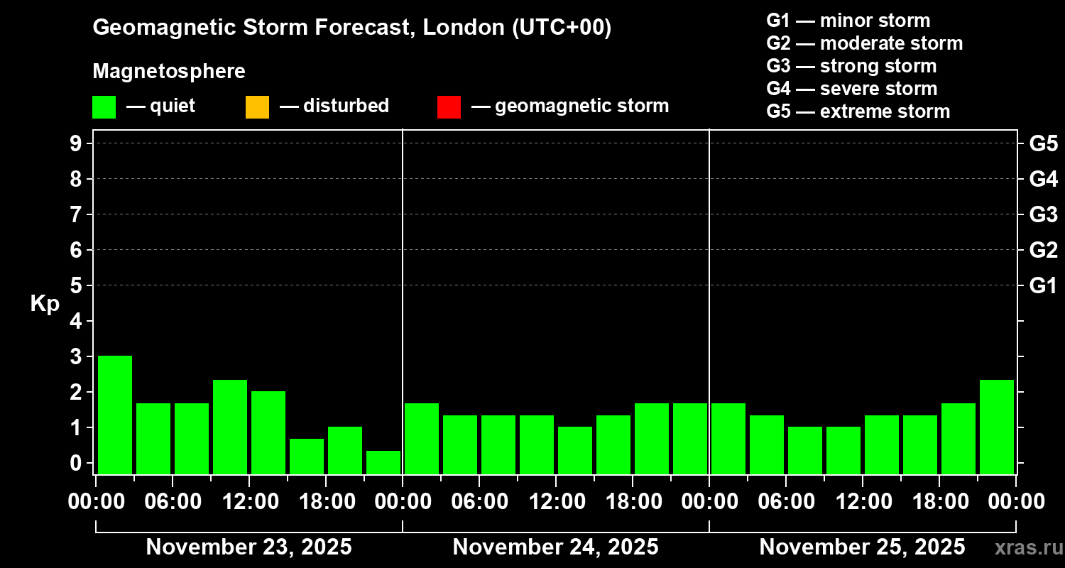 Geomagnetic storm forecast in London for Nov 23, 2025