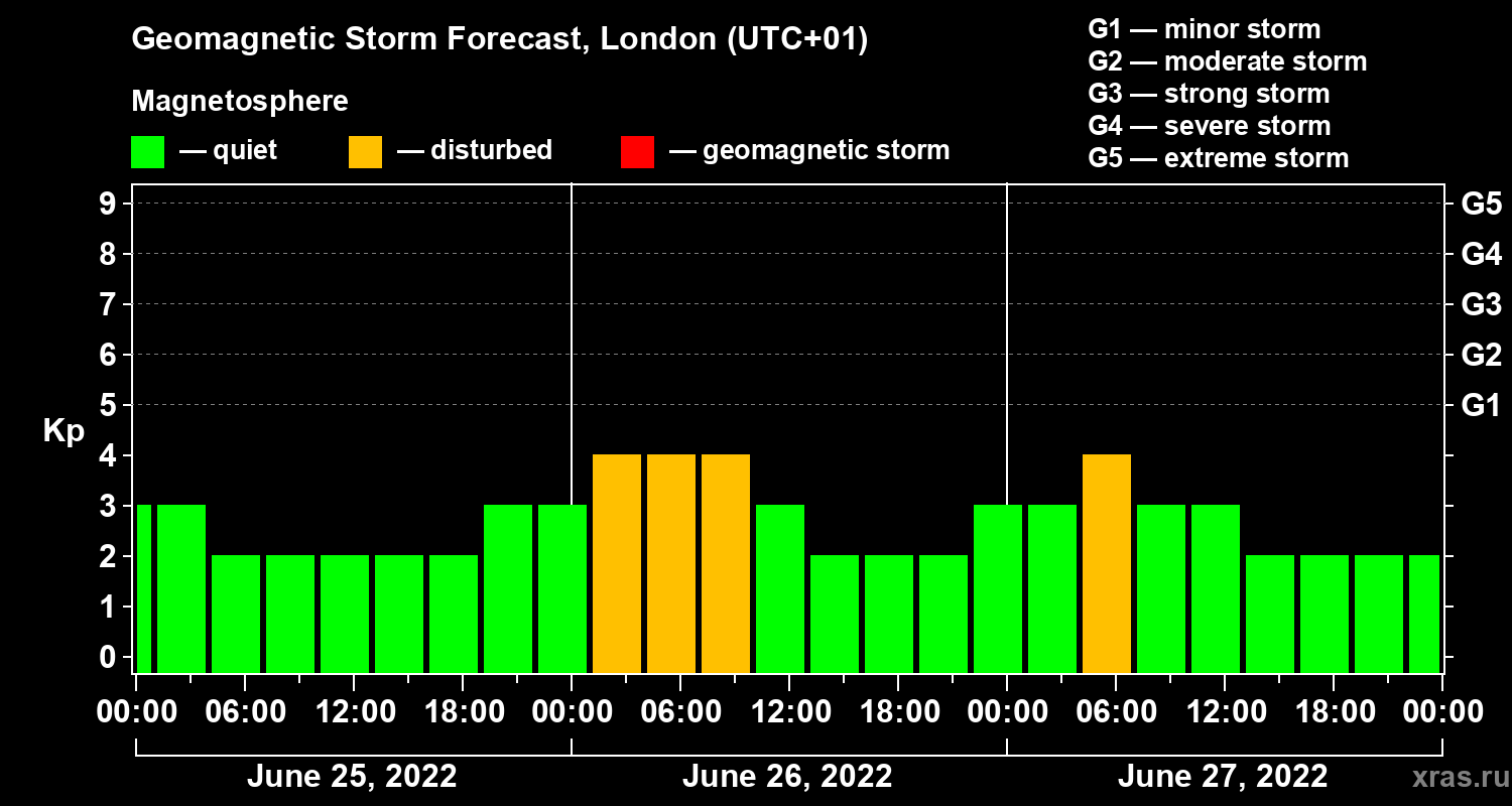 Geomagnetic storm forecast in London for Jun 25, 2022