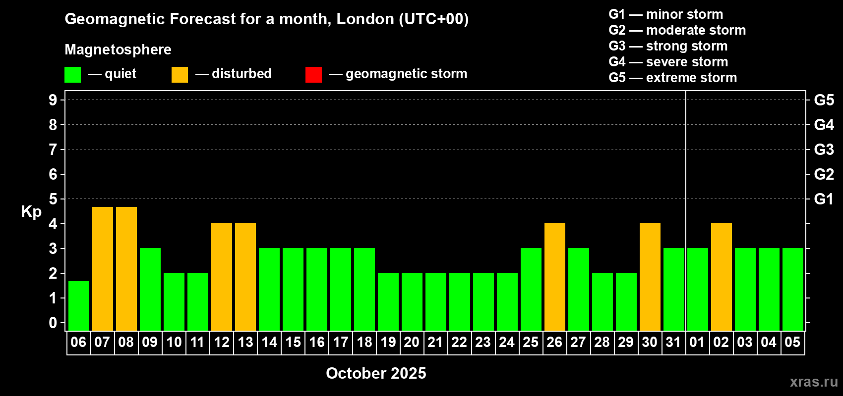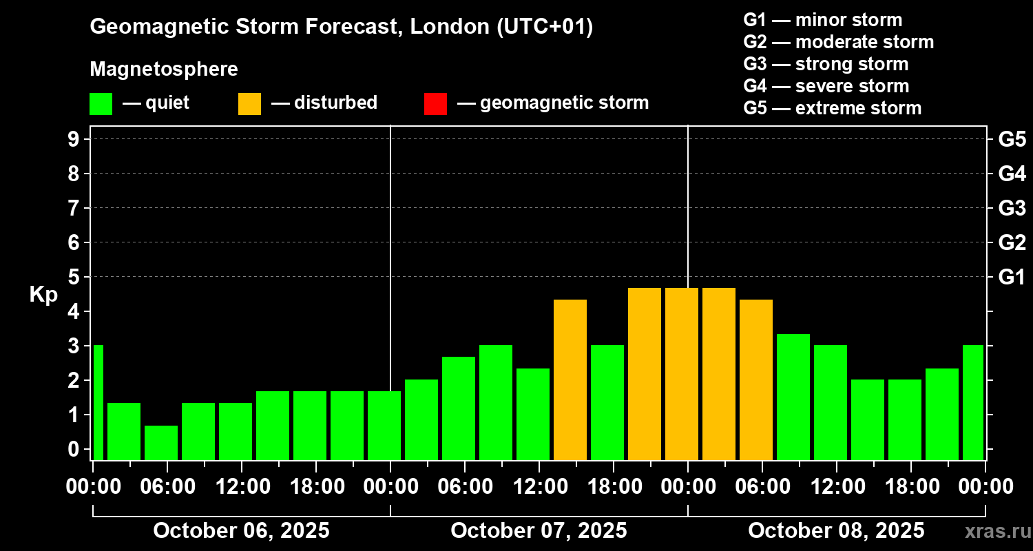 Geomagnetic storm forecast in London for Oct 06, 2025