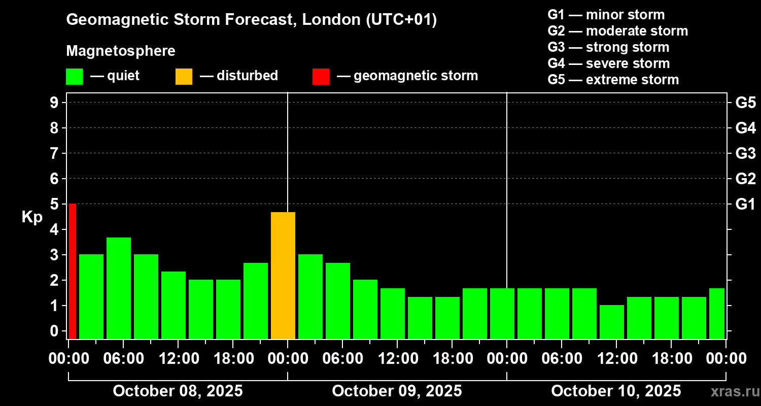 Geomagnetic storm forecast in London for Oct 08, 2025