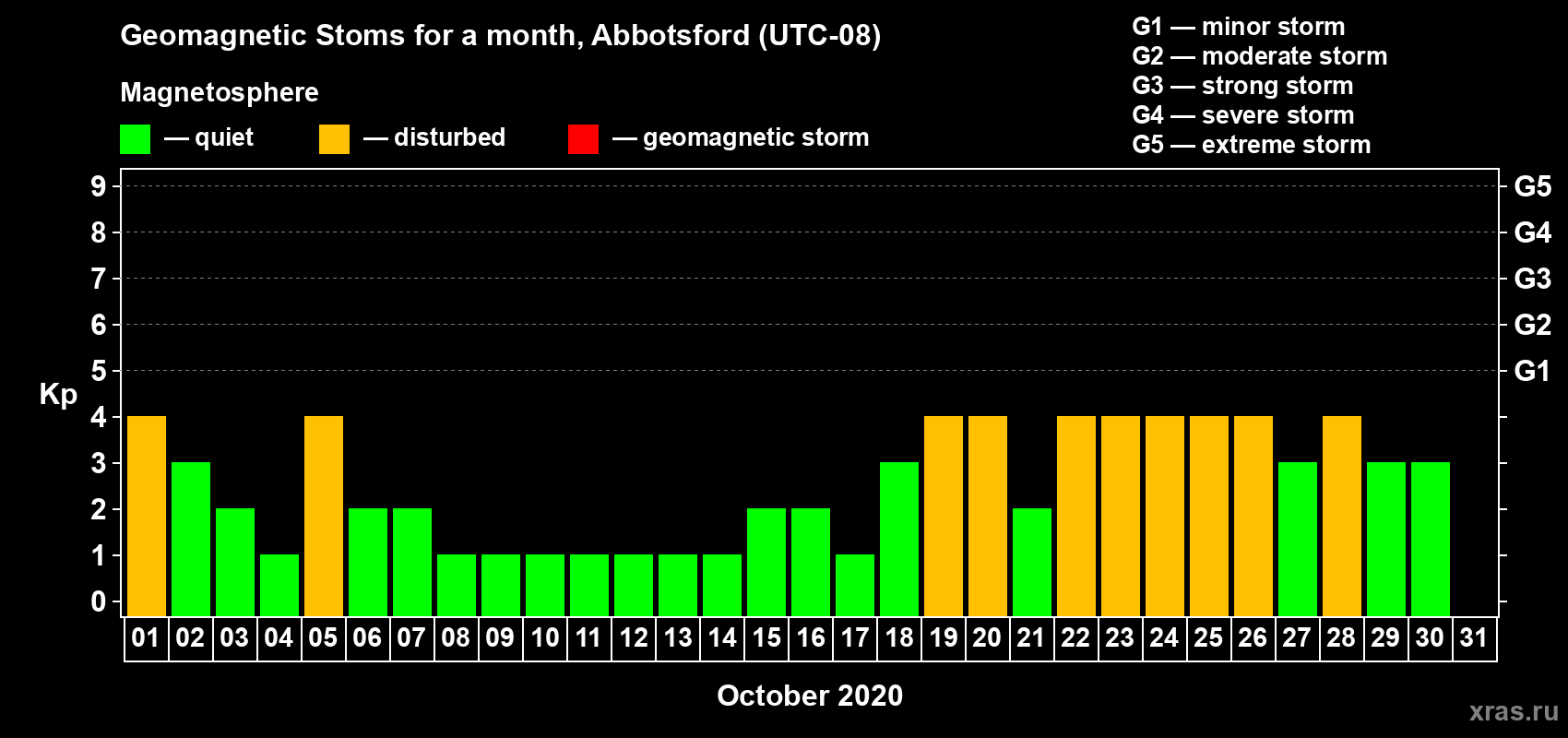 There were no days with an increased level of geomagnetic disturbance in October 2020