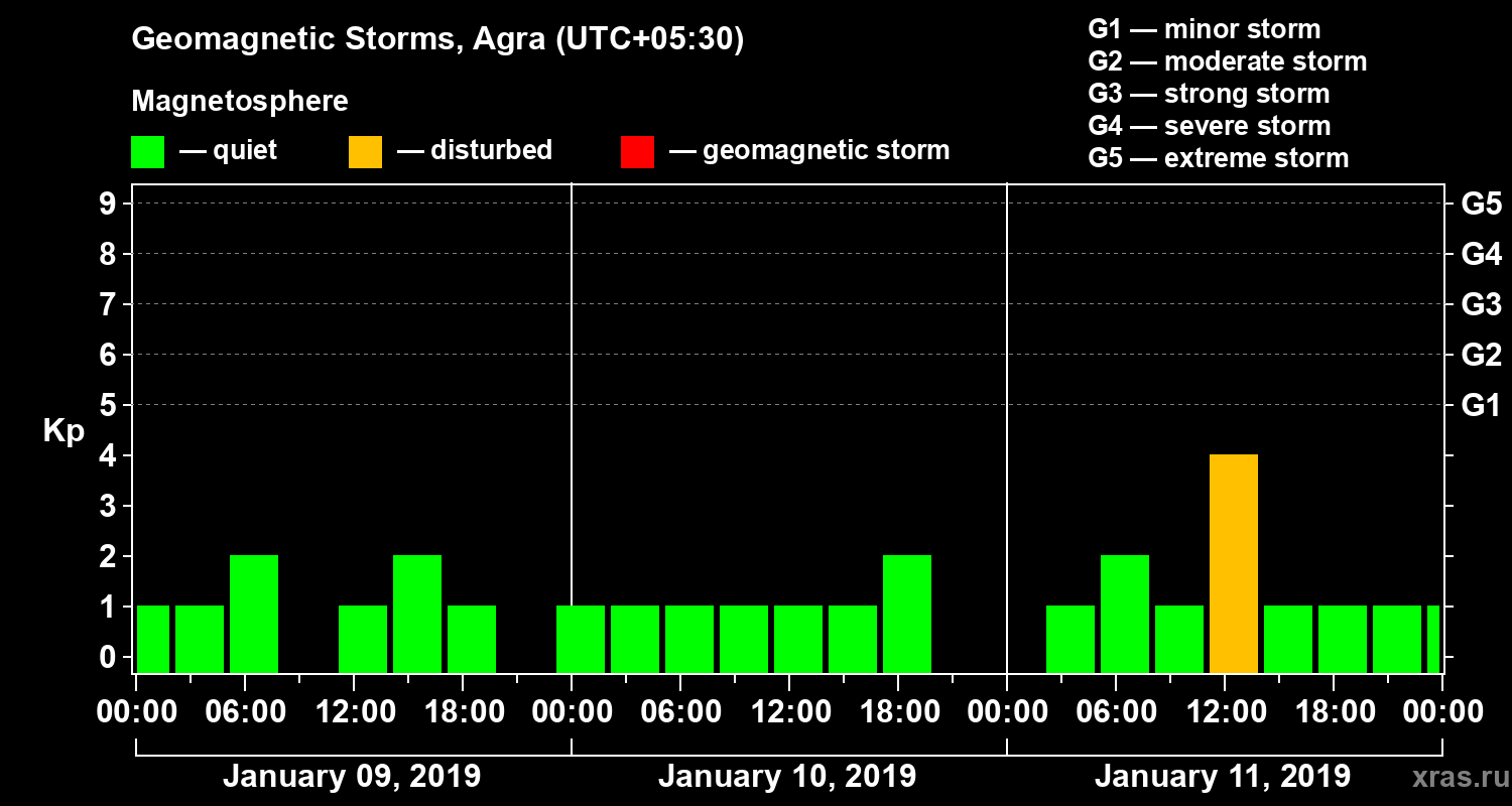 Changes in the geomagnetic index Kp from January 9 to 11, 2019 for mid latitudes