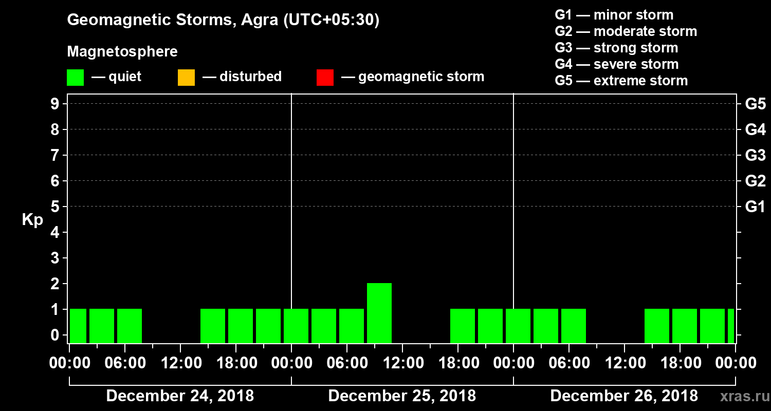 Changes in the geomagnetic index Kp from December 24 to 26, 2018 for mid latitudes