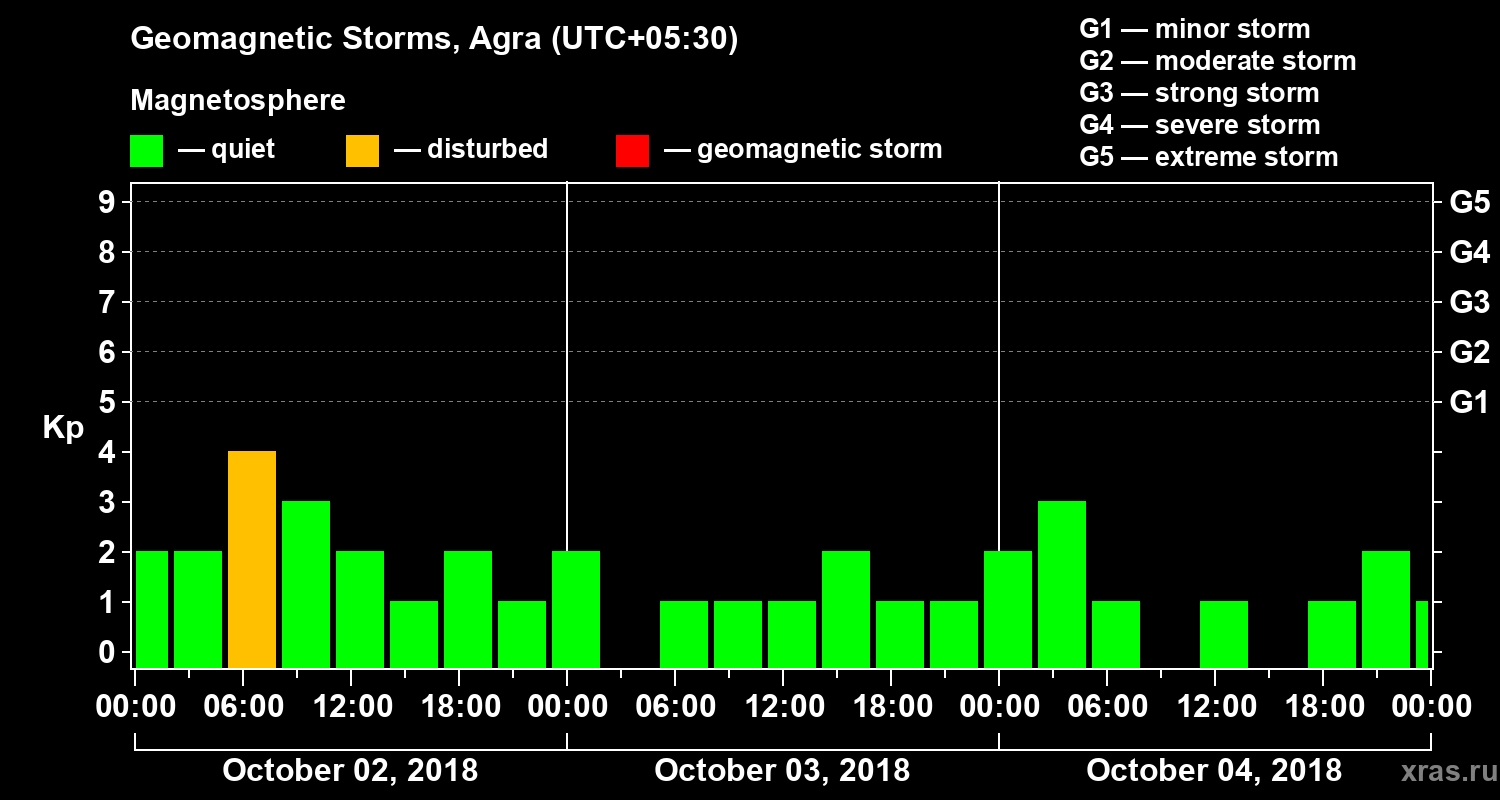 Changes in the geomagnetic index Kp from October 2 to 4, 2018 for mid latitudes