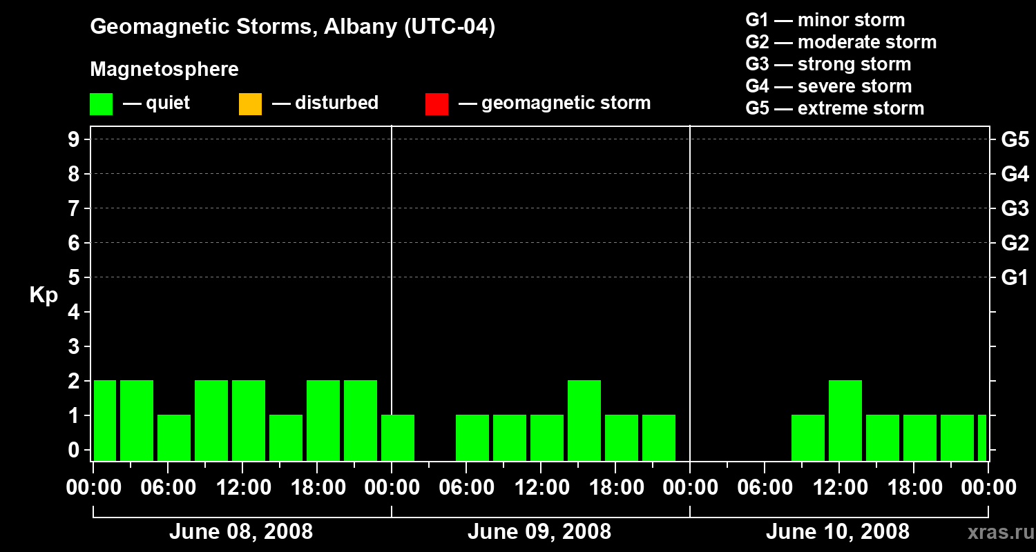 Changes in the geomagnetic index Kp from June 8 to 10, 2008 for mid latitudes