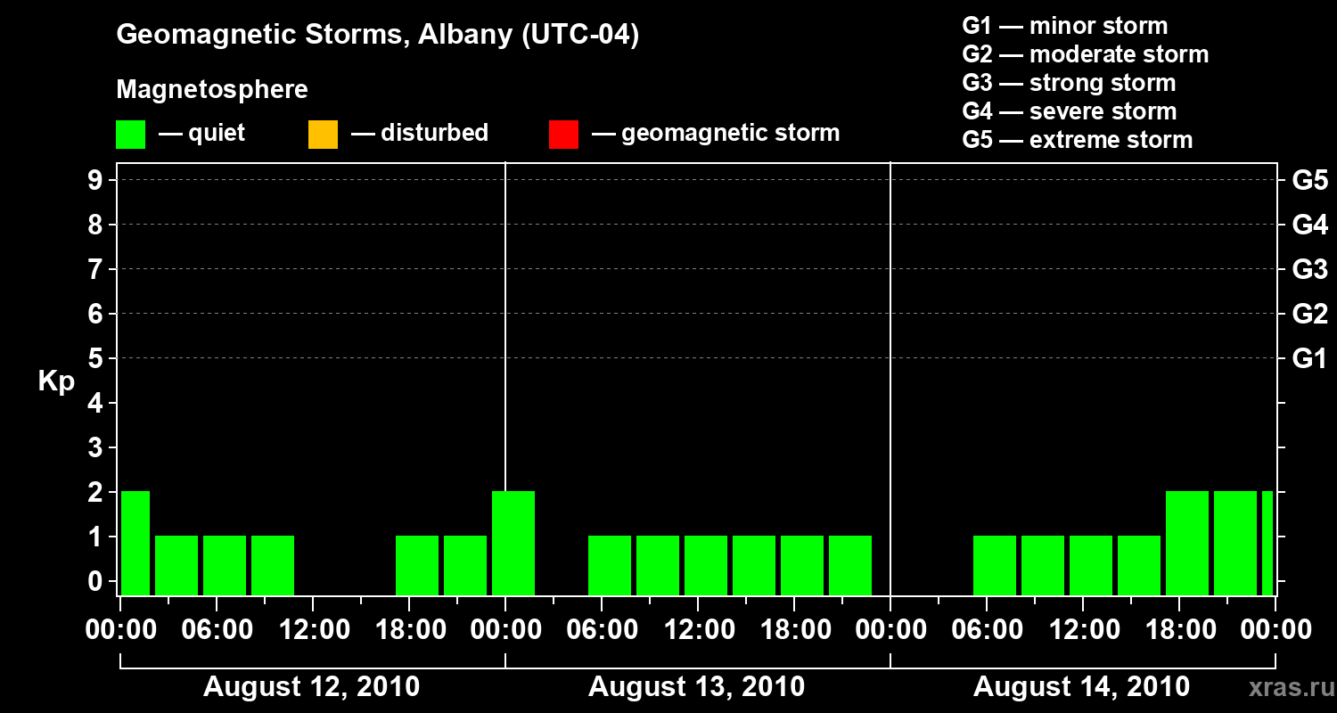 Changes in the geomagnetic index Kp from August 12 to 14, 2010 for mid latitudes
