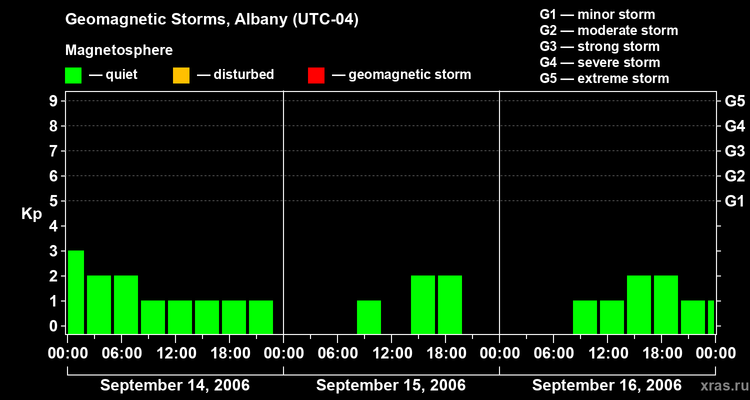 Changes in the geomagnetic index Kp from September 14 to 16, 2006 for mid latitudes