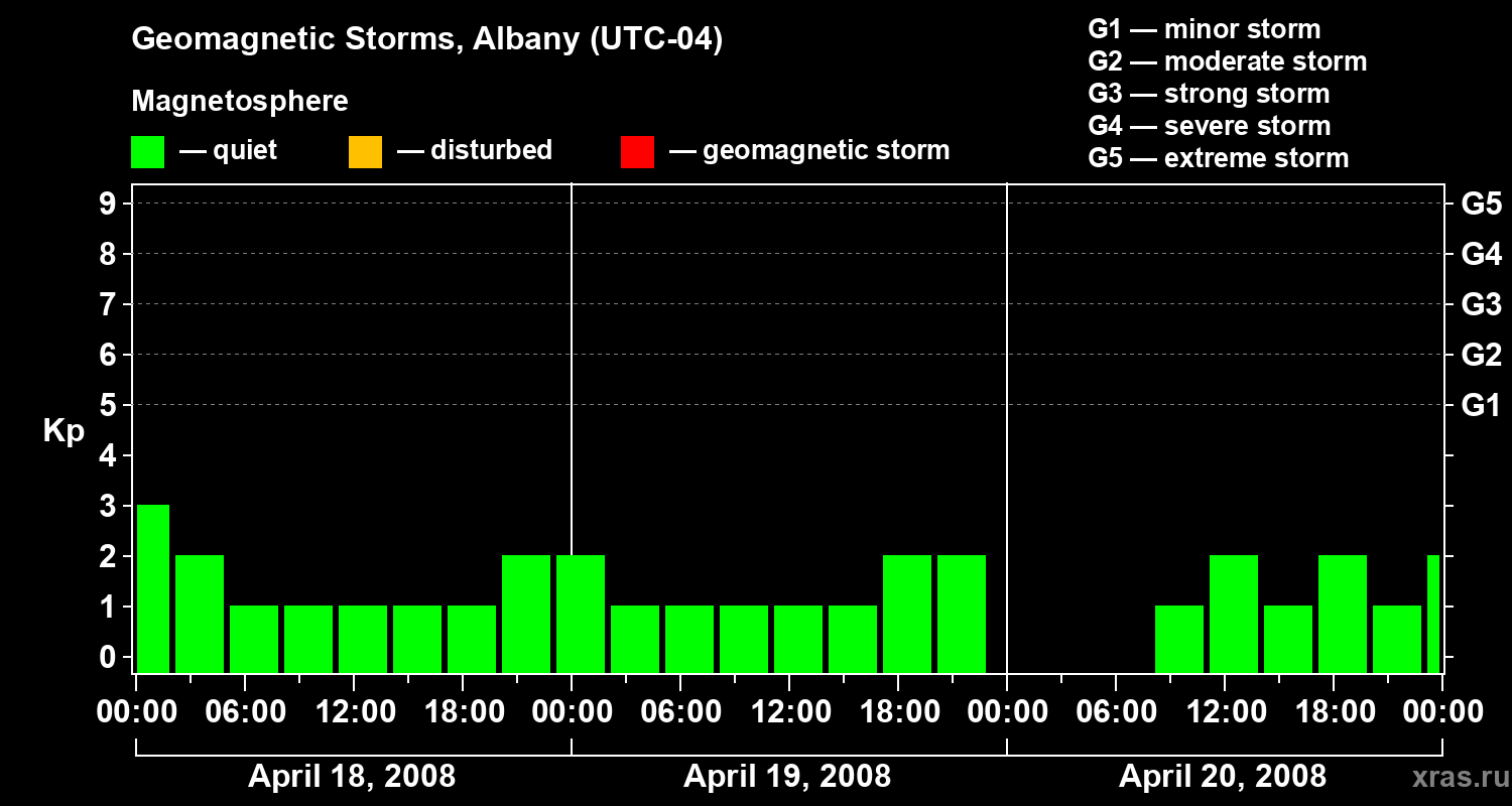 Changes in the geomagnetic index Kp from April 18 to 20, 2008 for mid latitudes