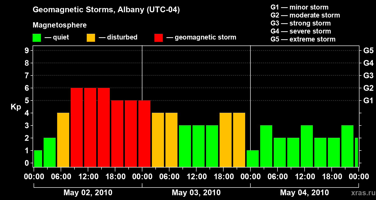 Changes in the geomagnetic index Kp from May 2 to 4, 2010 for mid latitudes