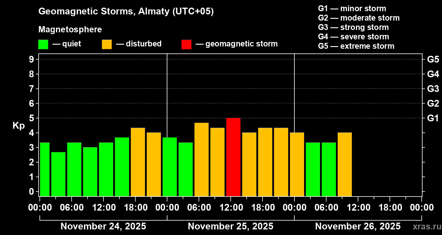 Изменения геомагнитного индекса Kp с 25 по 27 ноября 2025 года для средних широт