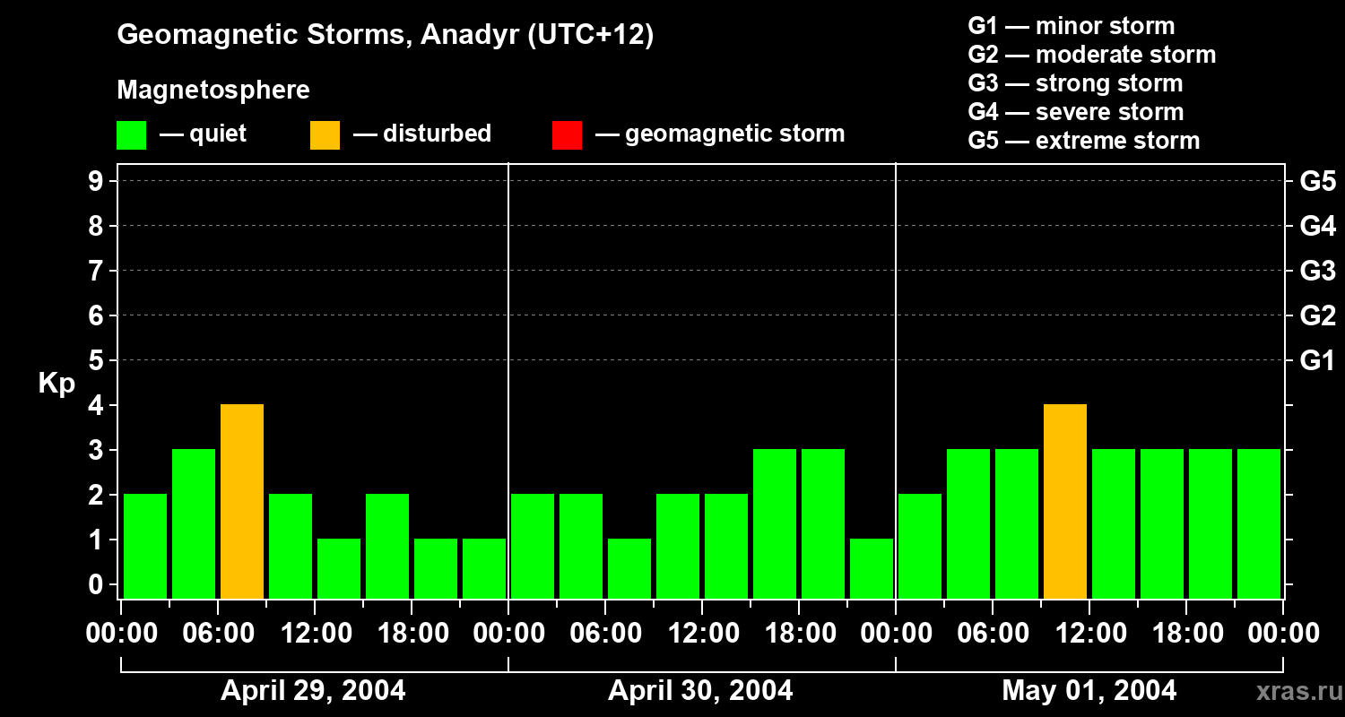 Changes in the geomagnetic index Kp from April 29 to May 1, 2004 for mid latitudes