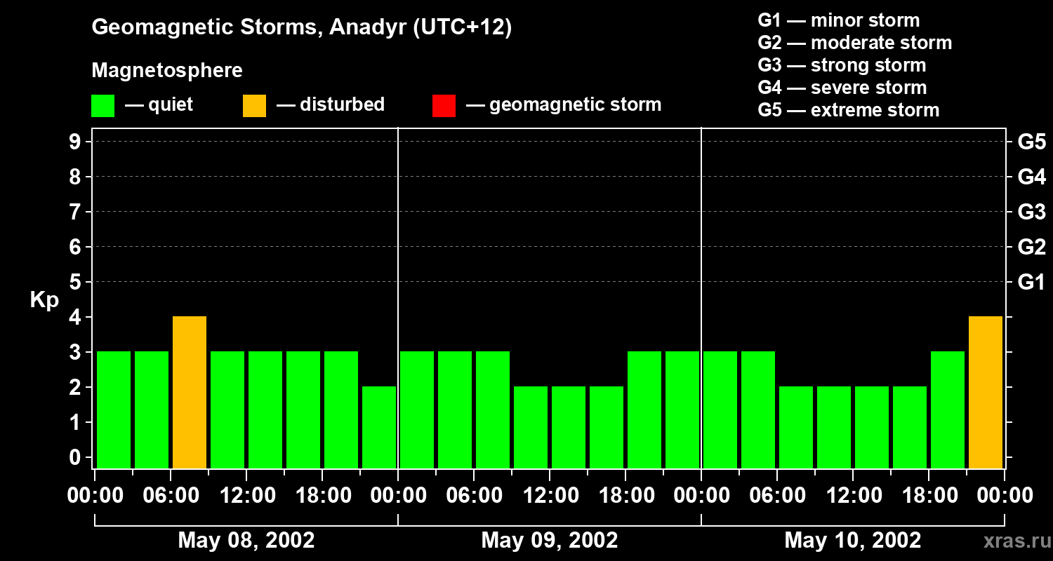Changes in the geomagnetic index Kp from May 8 to 10, 2002 for mid latitudes
