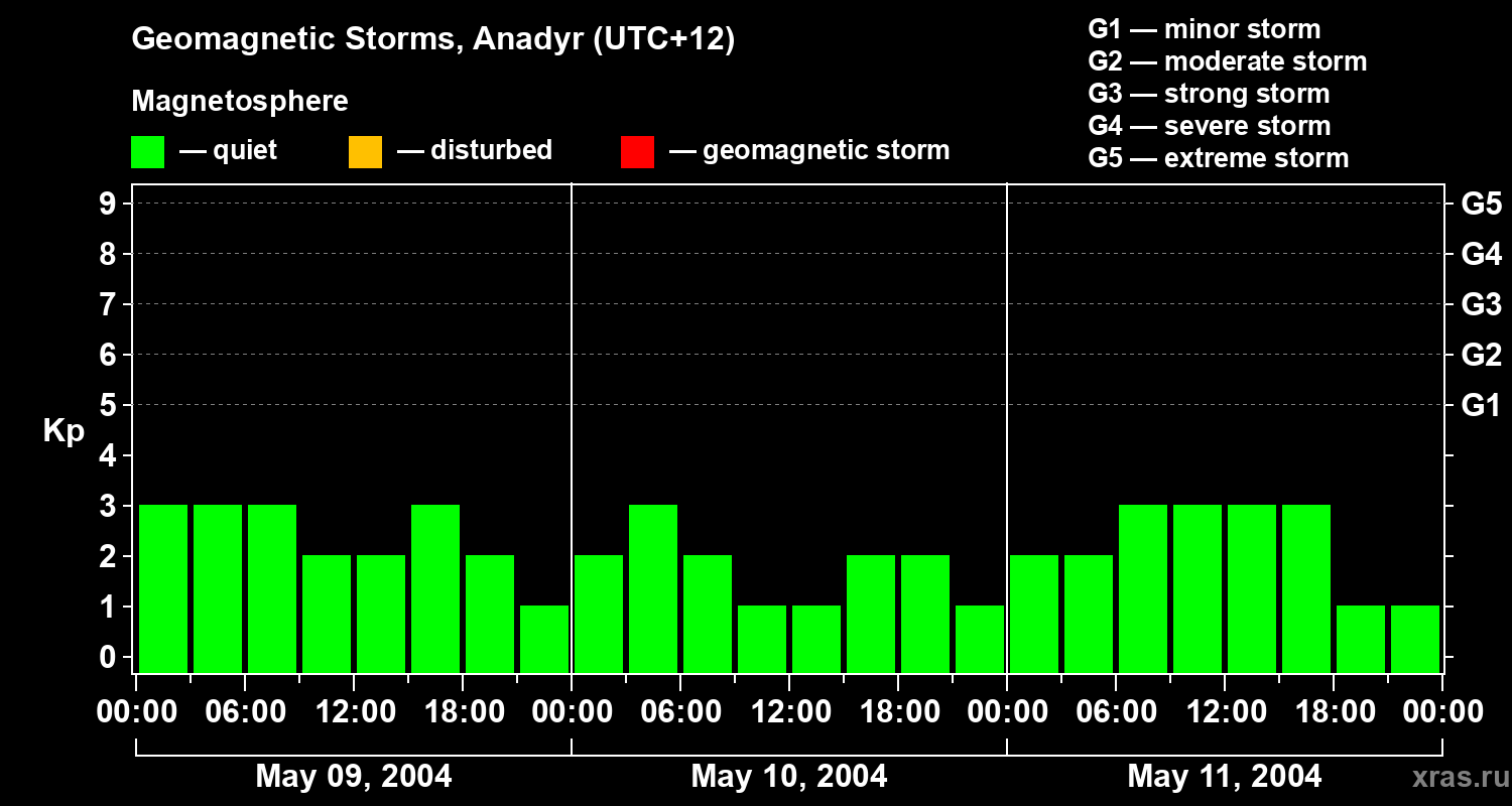 Changes in the geomagnetic index Kp from May 9 to 11, 2004 for mid latitudes