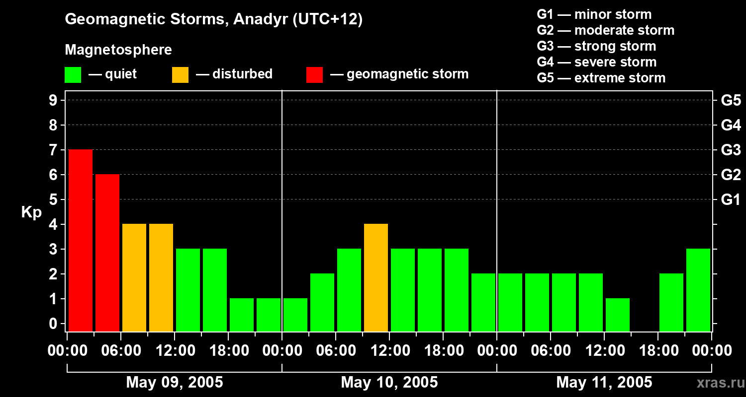Changes in the geomagnetic index Kp from May 9 to 11, 2005 for mid latitudes