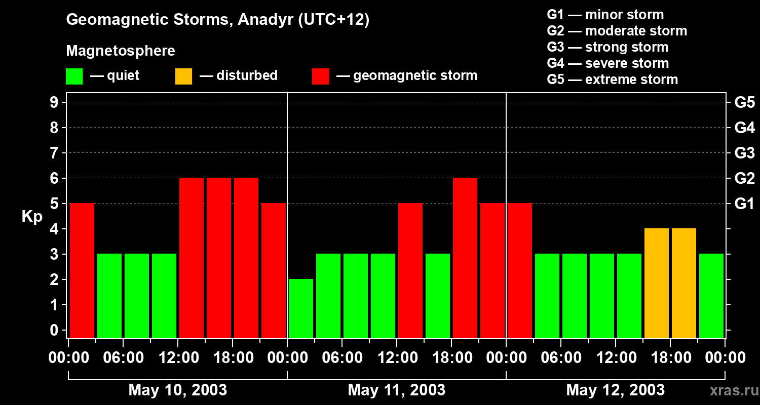 Changes in the geomagnetic index Kp from May 10 to 12, 2003 for mid latitudes