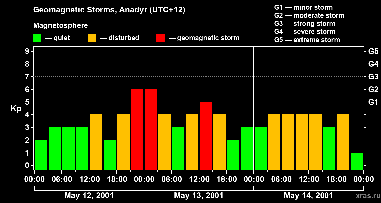 Changes in the geomagnetic index Kp from May 12 to 14, 2001 for mid latitudes