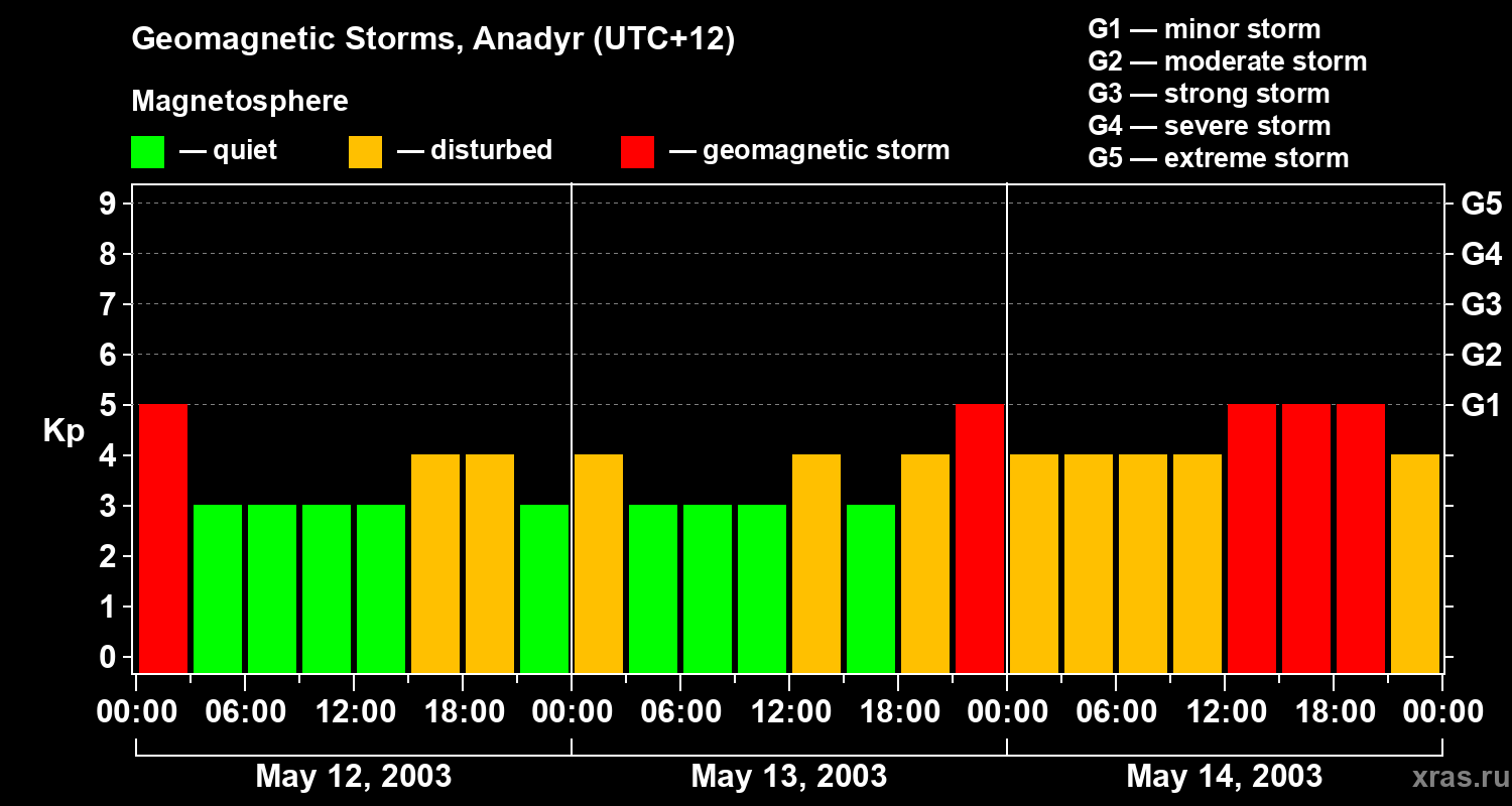 Changes in the geomagnetic index Kp from May 12 to 14, 2003 for mid latitudes