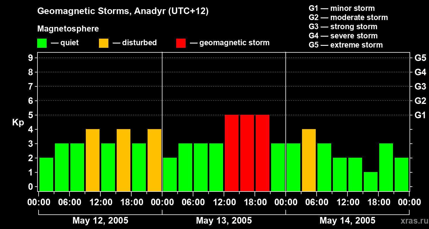 Changes in the geomagnetic index Kp from May 12 to 14, 2005 for mid latitudes