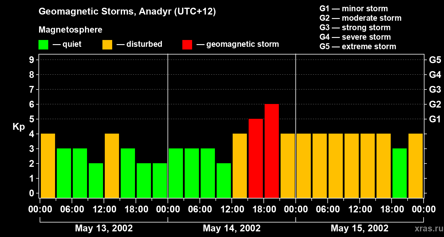 Changes in the geomagnetic index Kp from May 13 to 15, 2002 for mid latitudes