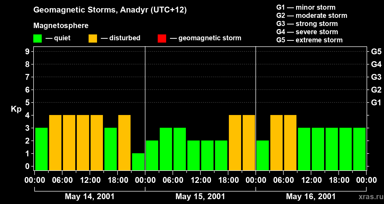 Changes in the geomagnetic index Kp from May 14 to 16, 2001 for mid latitudes