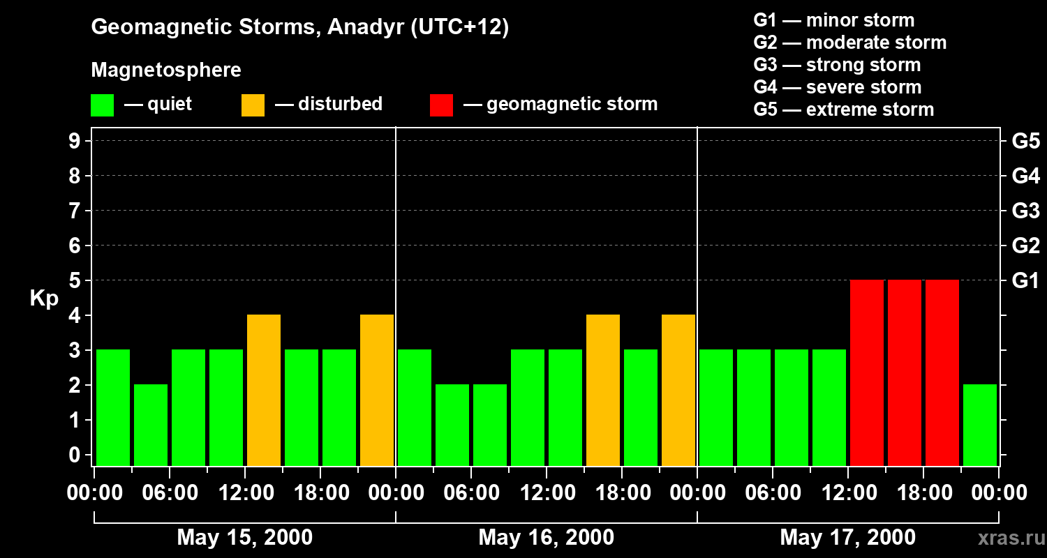 Changes in the geomagnetic index Kp from May 15 to 17, 2000 for mid latitudes
