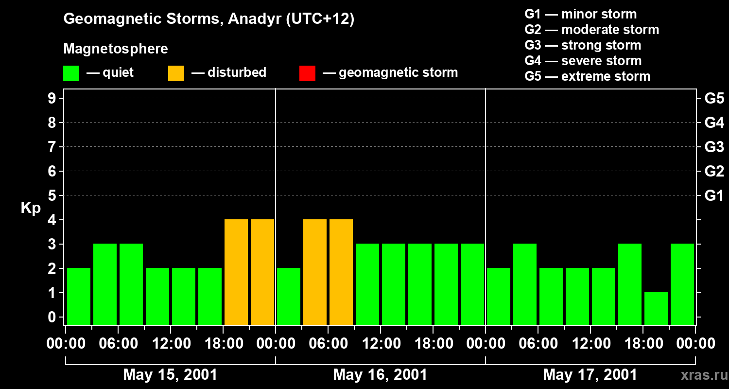 Changes in the geomagnetic index Kp from May 15 to 17, 2001 for mid latitudes