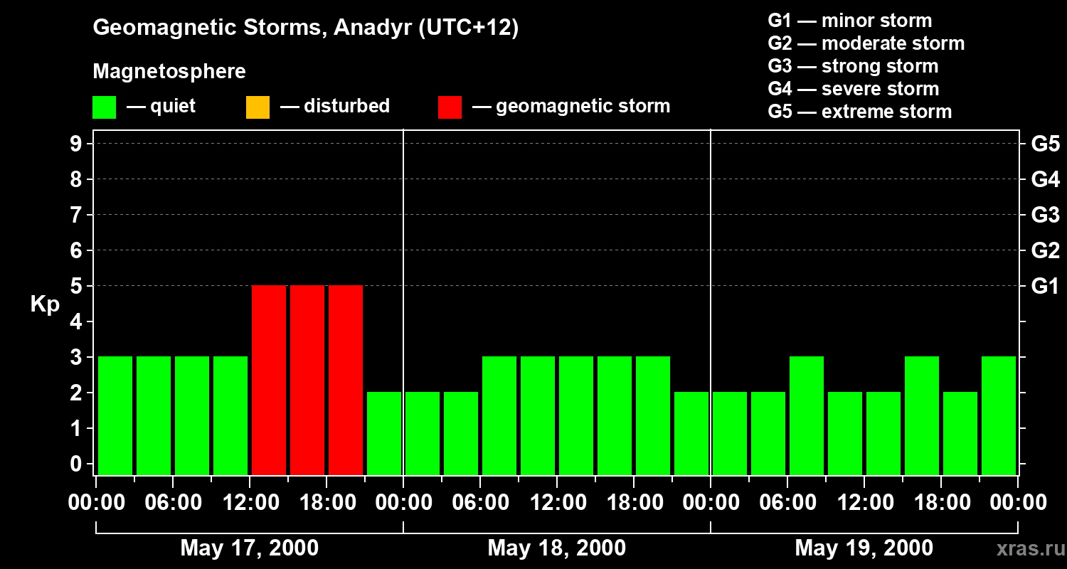 Changes in the geomagnetic index Kp from May 17 to 19, 2000 for mid latitudes