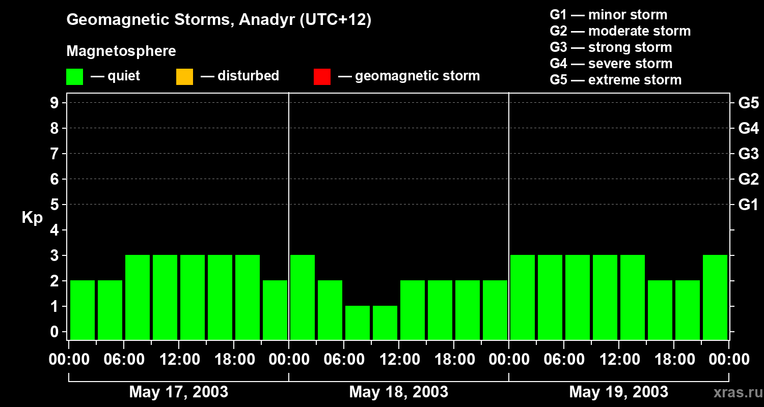 Changes in the geomagnetic index Kp from May 17 to 19, 2003 for mid latitudes