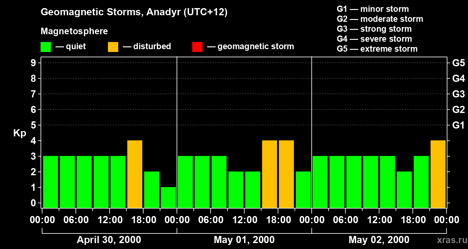 Changes in the geomagnetic index Kp from April 30 to May 2, 2000 for mid latitudes