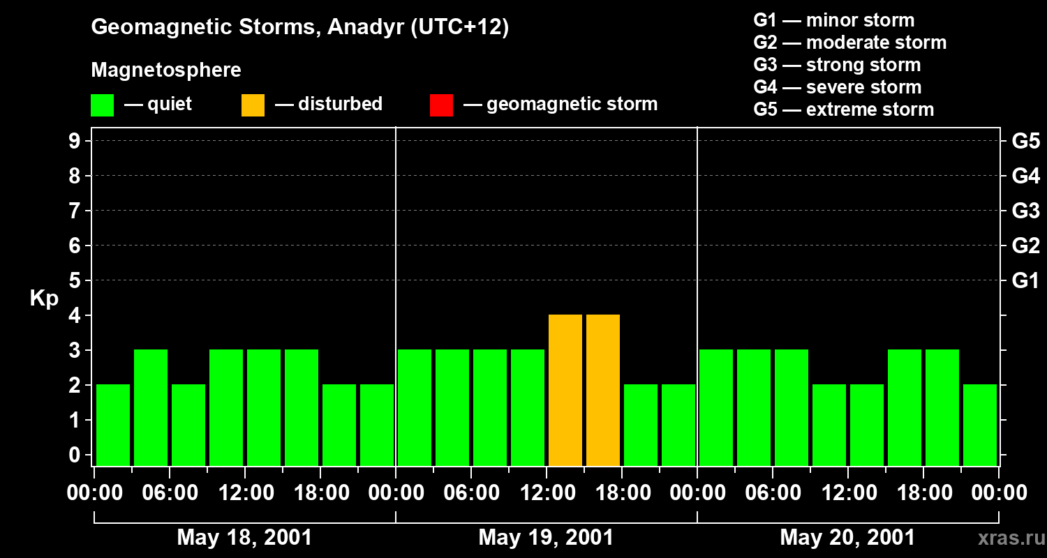 Changes in the geomagnetic index Kp from May 18 to 20, 2001 for mid latitudes