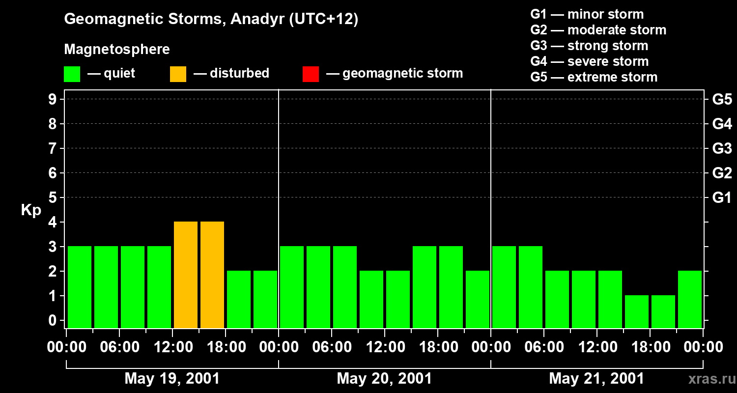 Changes in the geomagnetic index Kp from May 19 to 21, 2001 for mid latitudes