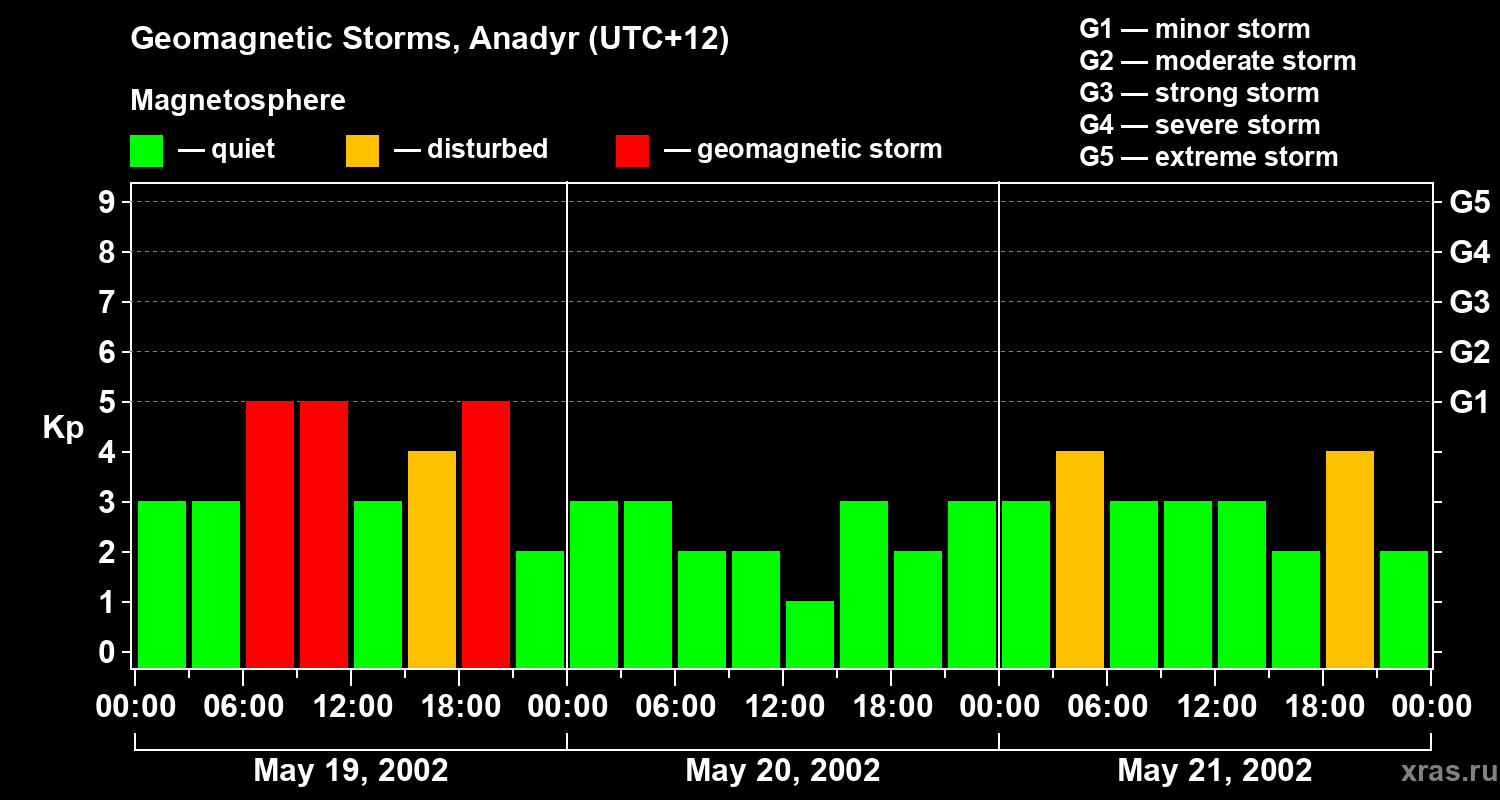 Changes in the geomagnetic index Kp from May 19 to 21, 2002 for mid latitudes