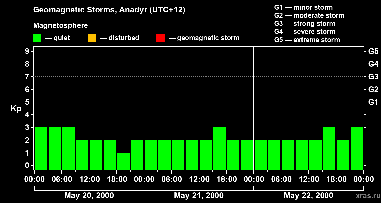 Changes in the geomagnetic index Kp from May 20 to 22, 2000 for mid latitudes