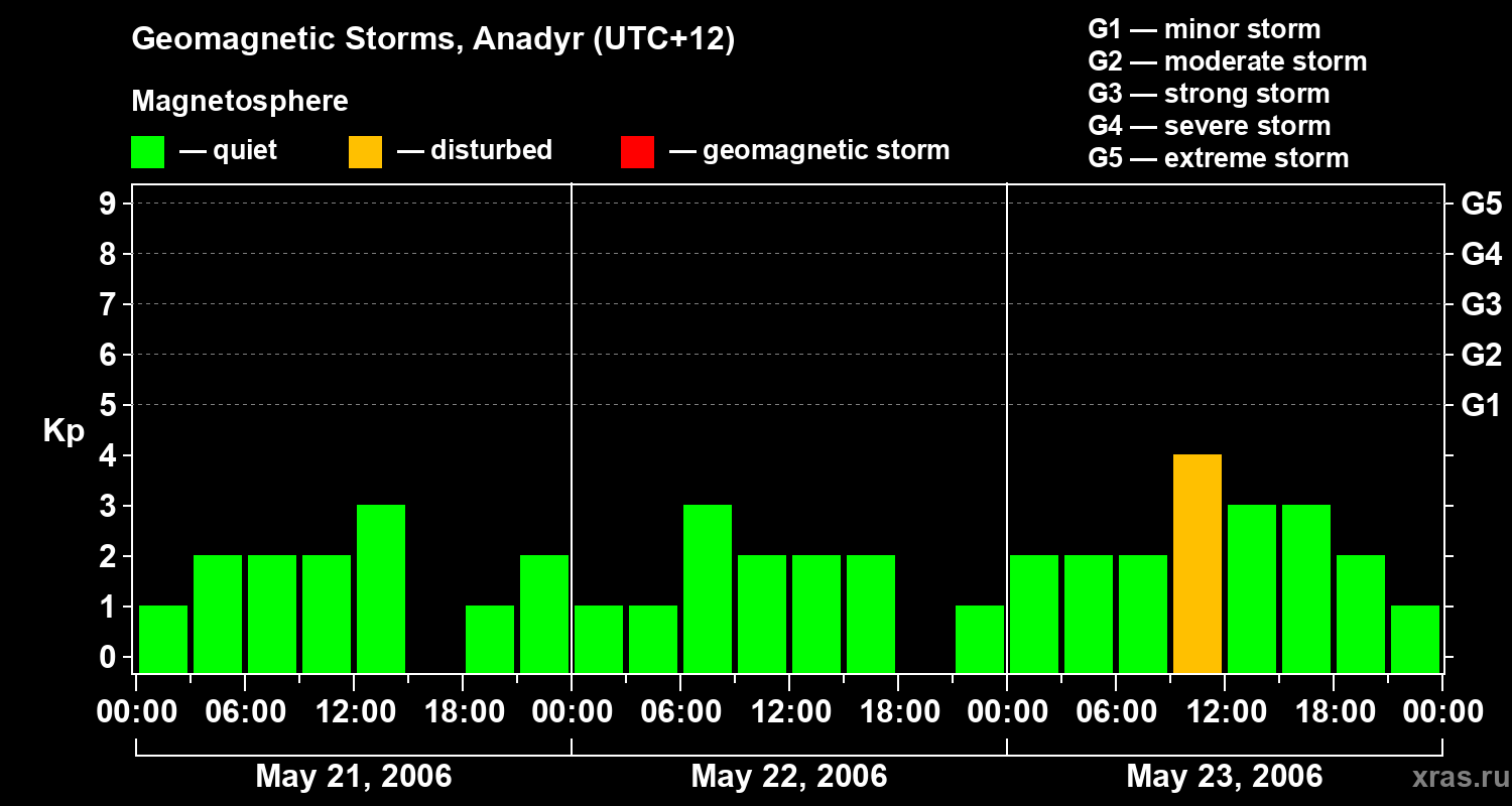 Changes in the geomagnetic index Kp from May 21 to 23, 2006 for mid latitudes