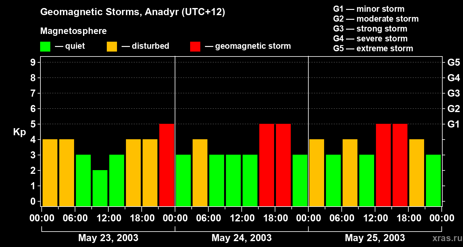 Changes in the geomagnetic index Kp from May 23 to 25, 2003 for mid latitudes