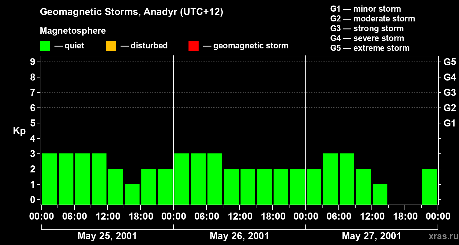 Changes in the geomagnetic index Kp from May 25 to 27, 2001 for mid latitudes