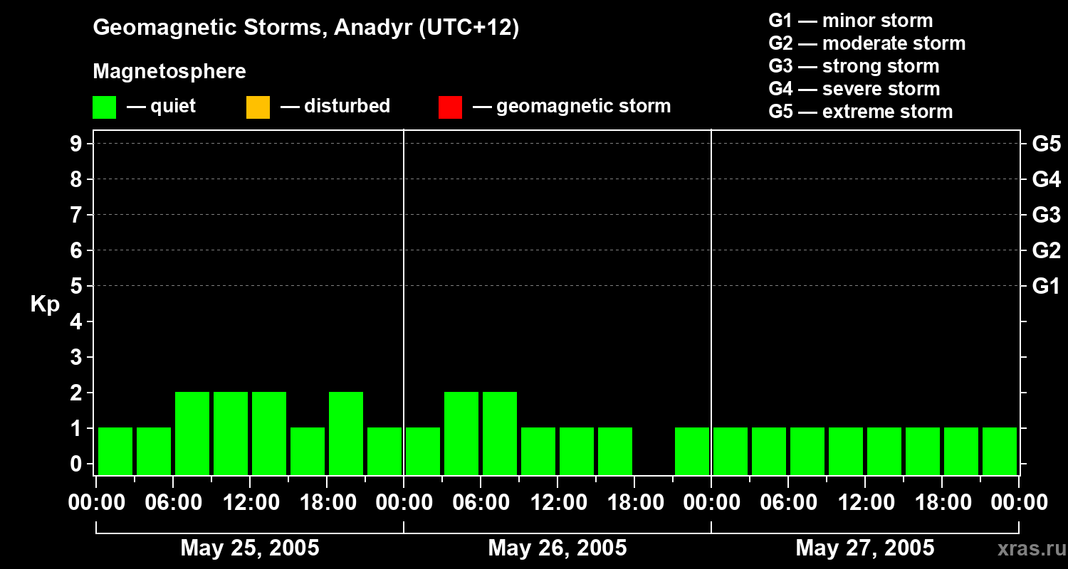 Changes in the geomagnetic index Kp from May 25 to 27, 2005 for mid latitudes