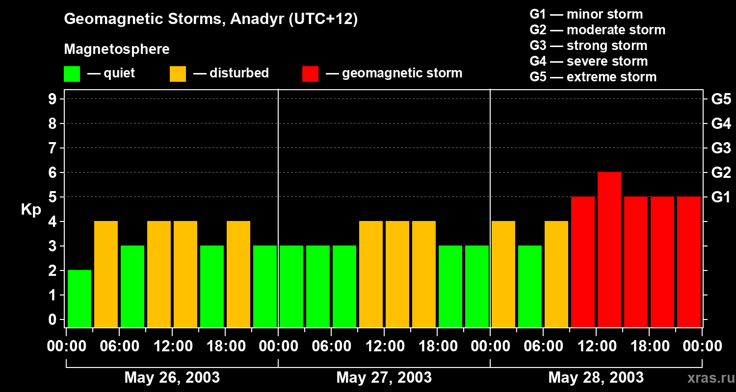 Changes in the geomagnetic index Kp from May 26 to 28, 2003 for mid latitudes