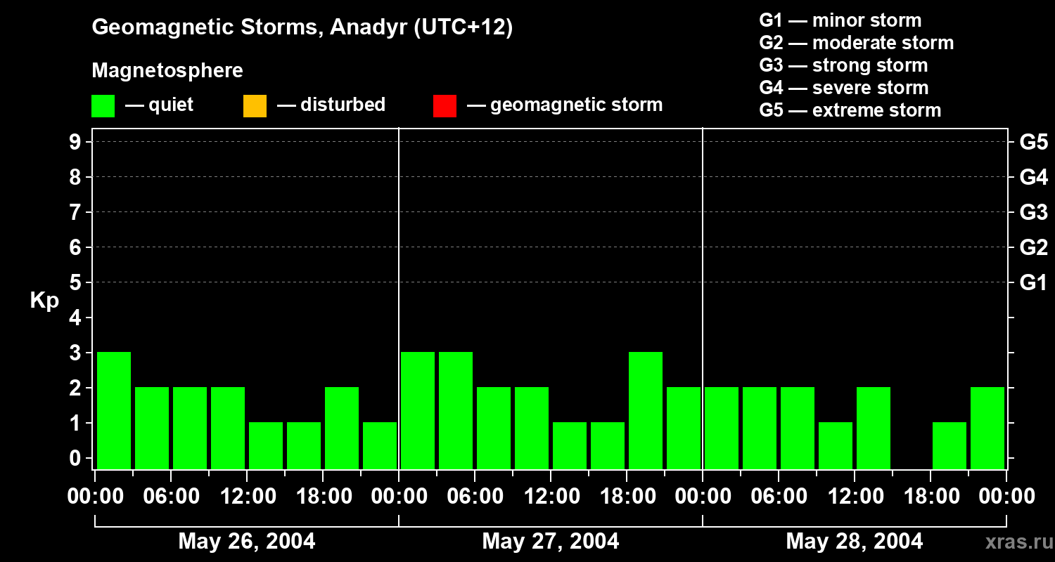 Changes in the geomagnetic index Kp from May 26 to 28, 2004 for mid latitudes