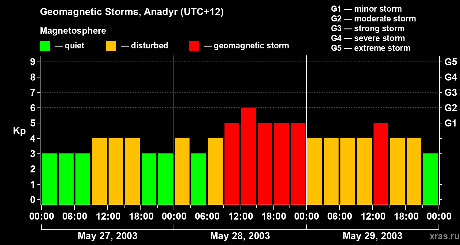 Changes in the geomagnetic index Kp from May 27 to 29, 2003 for mid latitudes