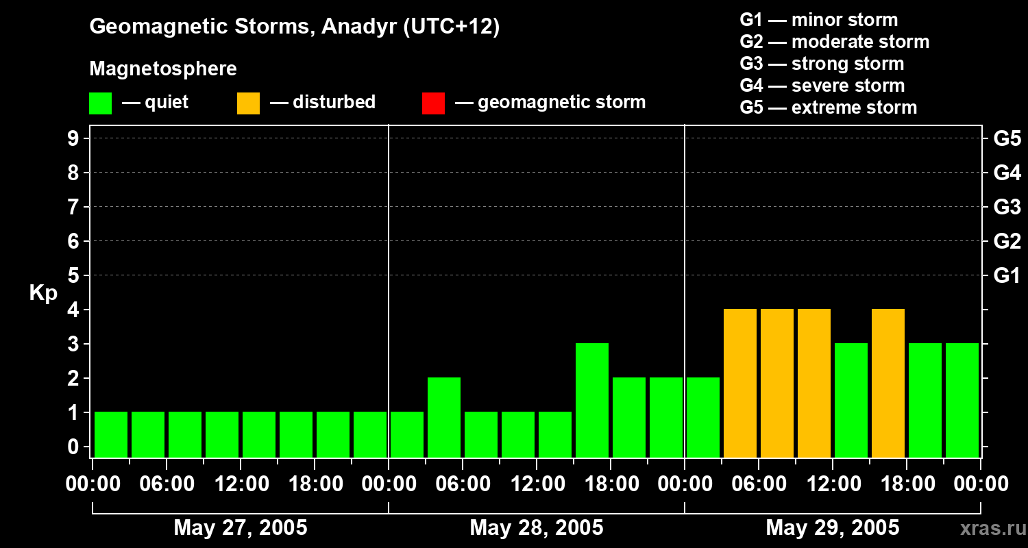 Changes in the geomagnetic index Kp from May 27 to 29, 2005 for mid latitudes
