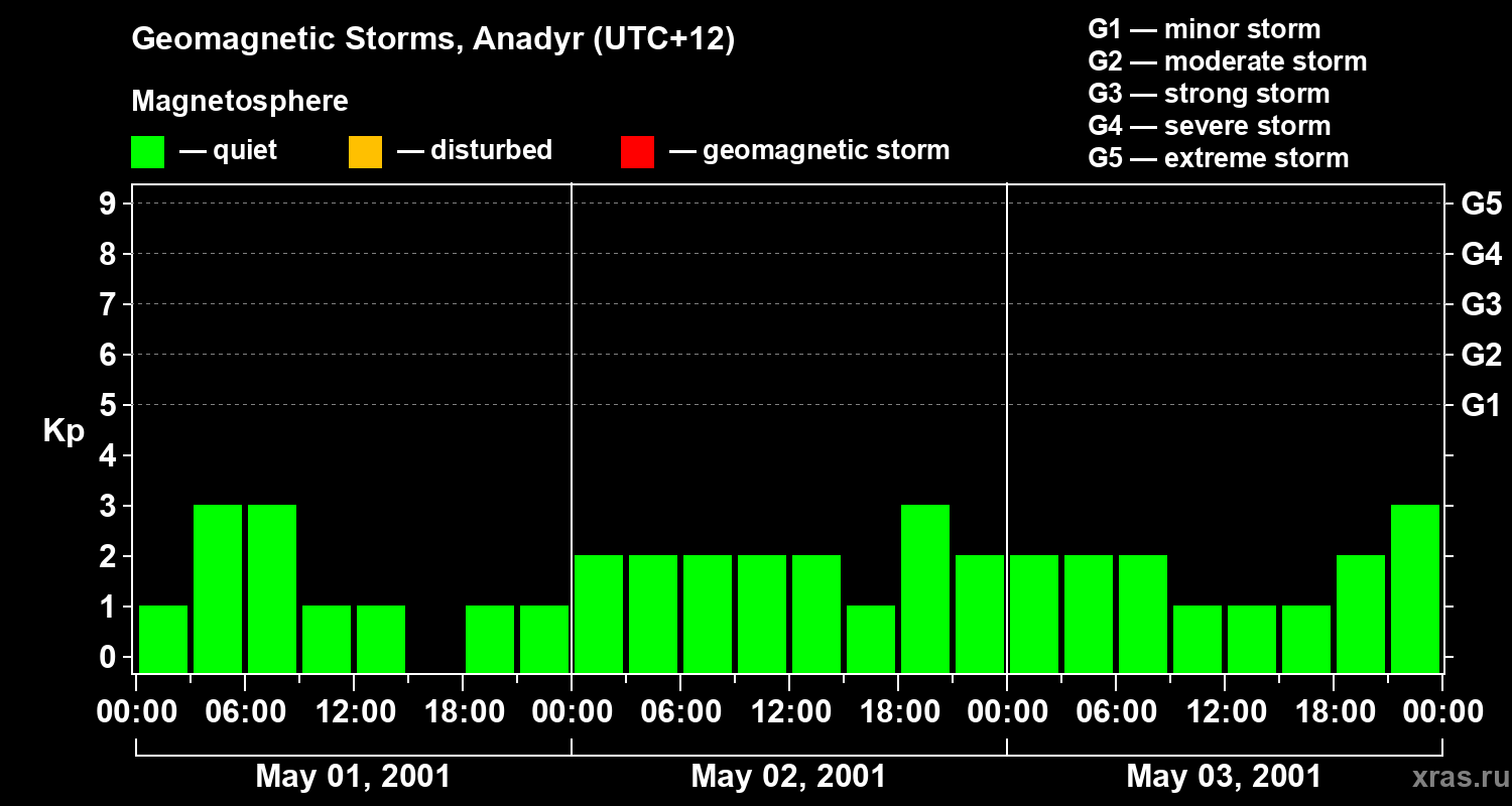 Changes in the geomagnetic index Kp from May 1 to 3, 2001 for mid latitudes