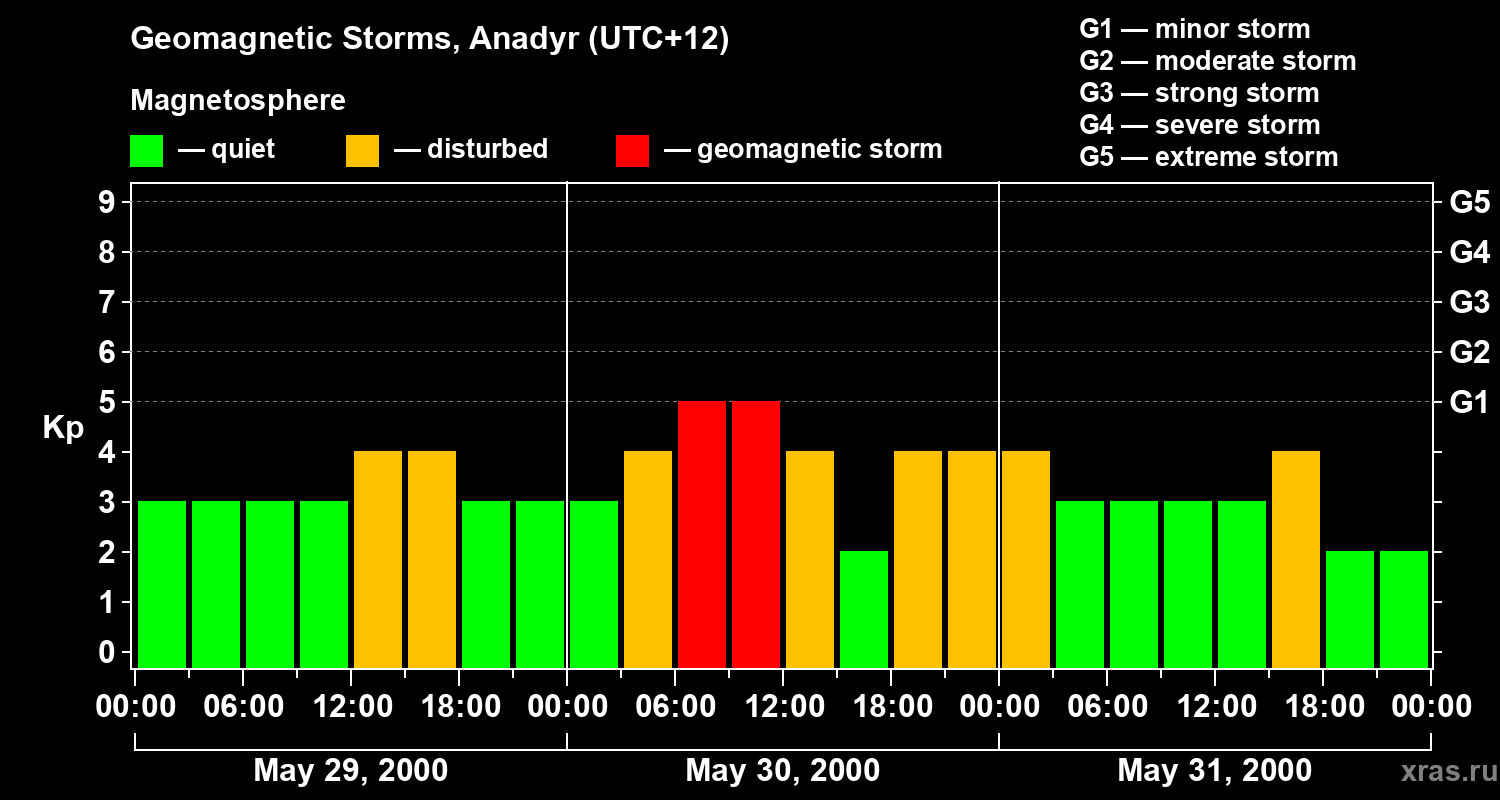 Changes in the geomagnetic index Kp from May 29 to 31, 2000 for mid latitudes